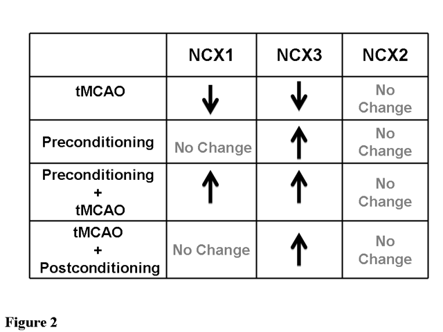 As concern the role played by NCX during brain postconditioning, we demonstrated that among the three NCX isoforms expressed in the CNS, NCX3 represents an additional new molecular effector involved in the neuroprotection exerted by ischemic postconditioning. In particular, in our experimental model of ischemic postconditioning, obtained by subjecting adult male rats to 10 minutes of subliminal tMCAO applied 10 minutes after 100 minutes of tMCAO, we provided solid evidence showing that p-AKT is the mediator of this action since (1) p-AKT expression after postconditioning increased and timely mirrors that of NCX3; (2) NCX3 downregulation, induced by siRNA, reverts the neuroprotection induced by ischemic postconditioning; and (3) the selective p-AKT inhibition prevents NCX3 up-regulation thus reverting the postconditioning-induced neuroprotection (Pignataro et al., 2011).